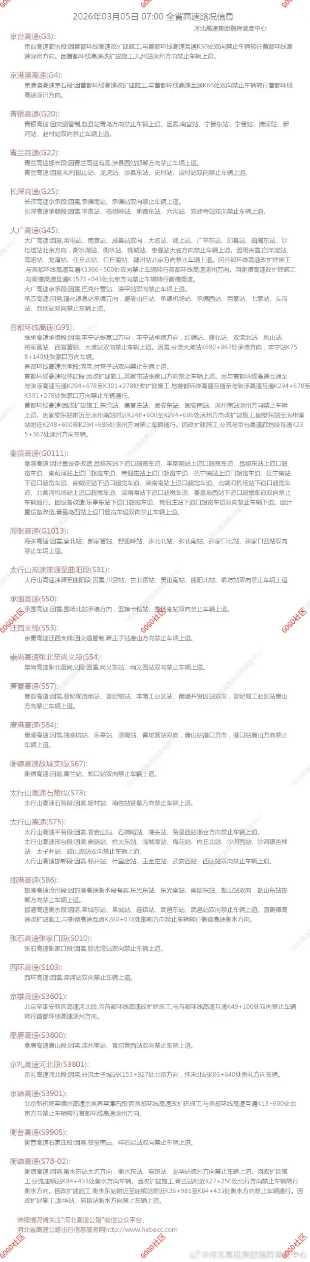 更多高速实时路况信息,点击“河北交警微发布”微信底部菜单栏“实时路况”→“高速视频”(此项需先关注“畅行燕赵”公众号)、“高速路况”查看。