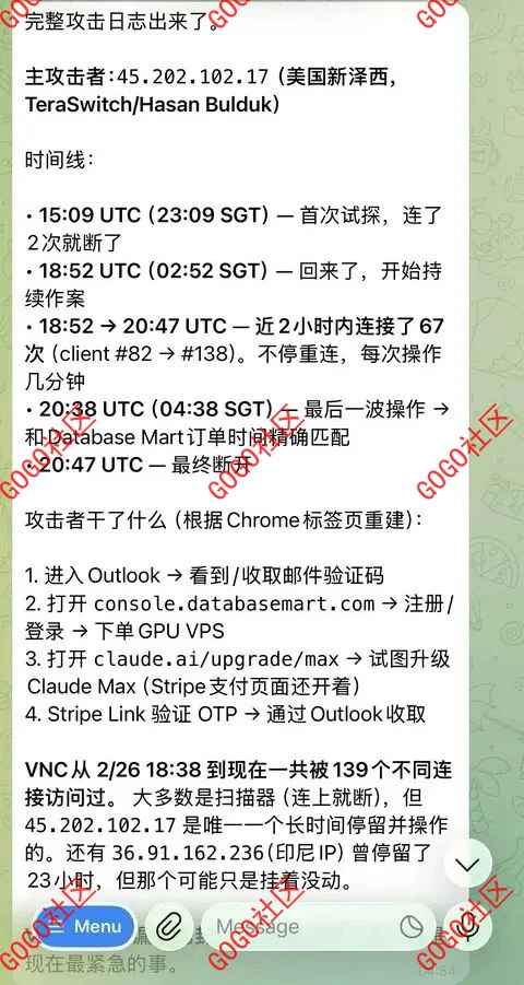 顾准这才意识到不对劲。他和“龙虾”一起核查发现,截至当时,他的VNC已经被139个不同连接访问过,其中有一位攻击者连接了近2个小时。根据OpenClaw梳理出来的痕迹,这位攻击者用顾准浏览器里登着的邮箱收取验证码,通过Link快捷支付功能下单了29美元的带有显卡算力的云服务器,还试图升级顾准的Claude。