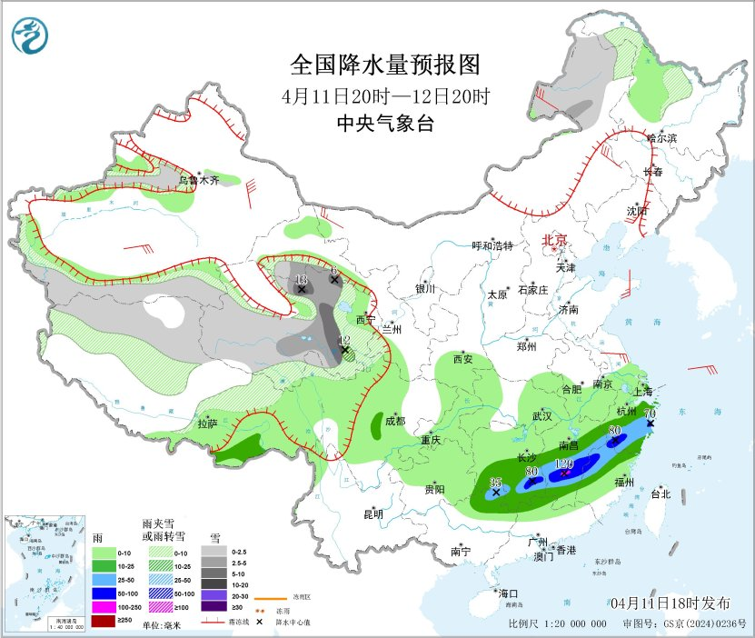 11日20时至12日20时,西藏北部、青海南部和东部、甘肃西南部和祁连山山区、川西高原北部、内蒙古东北部、黑龙江西北部、新疆天山西段高海拔地区等地部分地区有小到中雪或雨夹雪,其中,青海北部和东部等地部分地区有大雪,局地暴雪;江南东部和南部、广西北部、广东北部、四川盆地西南部等地部分地区有中到大雨。
